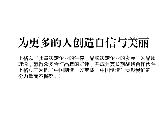 上格一路走來,以“締造時(shí)尚集團(tuán),使公司受人尊敬,令人向往;為客戶提升價(jià)值,創(chuàng)造成功;讓員工提高生活品質(zhì),實(shí)現(xiàn)自我價(jià)值”作為我們的目標(biāo),“為更多的創(chuàng)造自信與美麗” 作為我們的使命,立志為把“中國(guó)制造” 改變成“中國(guó)創(chuàng)造”貢獻(xiàn)我們的一份力量而不懈努力!